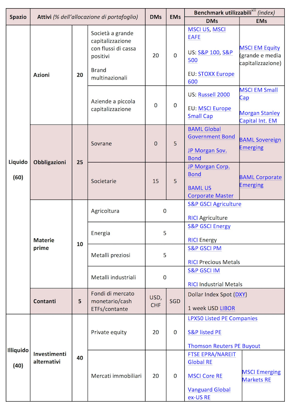 Priorità d’investimento. Solo il 60 per cento degli attivi andrebbe mantenuto liquido, e il 40 per cento dovrebbe essere illiquido. L’allocazione strategica degli asset (strategic asset allocation – SAA) è riportata nel Riquadro 1: