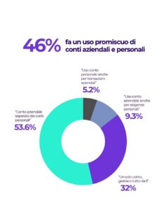 Ancora una volta, però, i dati della survey che abbiamo condotto a novembre ci restituiscono un quadro che non possiamo ignorare: stiamo delegando all’AI la relazione con un cliente medio che ha importanti lacune finanziarie. Quasi la metà degli imprenditori fa un uso promiscuo dei propri conti bancari: il 9% effettua acquisti personali con il conto business, al 5% capita di realizzare transazioni aziendali con il conto personale e il 32% possiede un solo conto da cui gestisce tutto indistintamente.